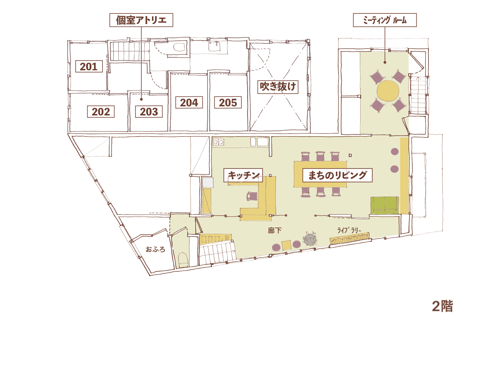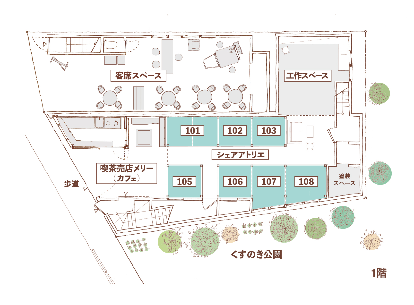 アーティストやお子さん連れが集まるコミュニティスペース「くすのき荘」があります。
