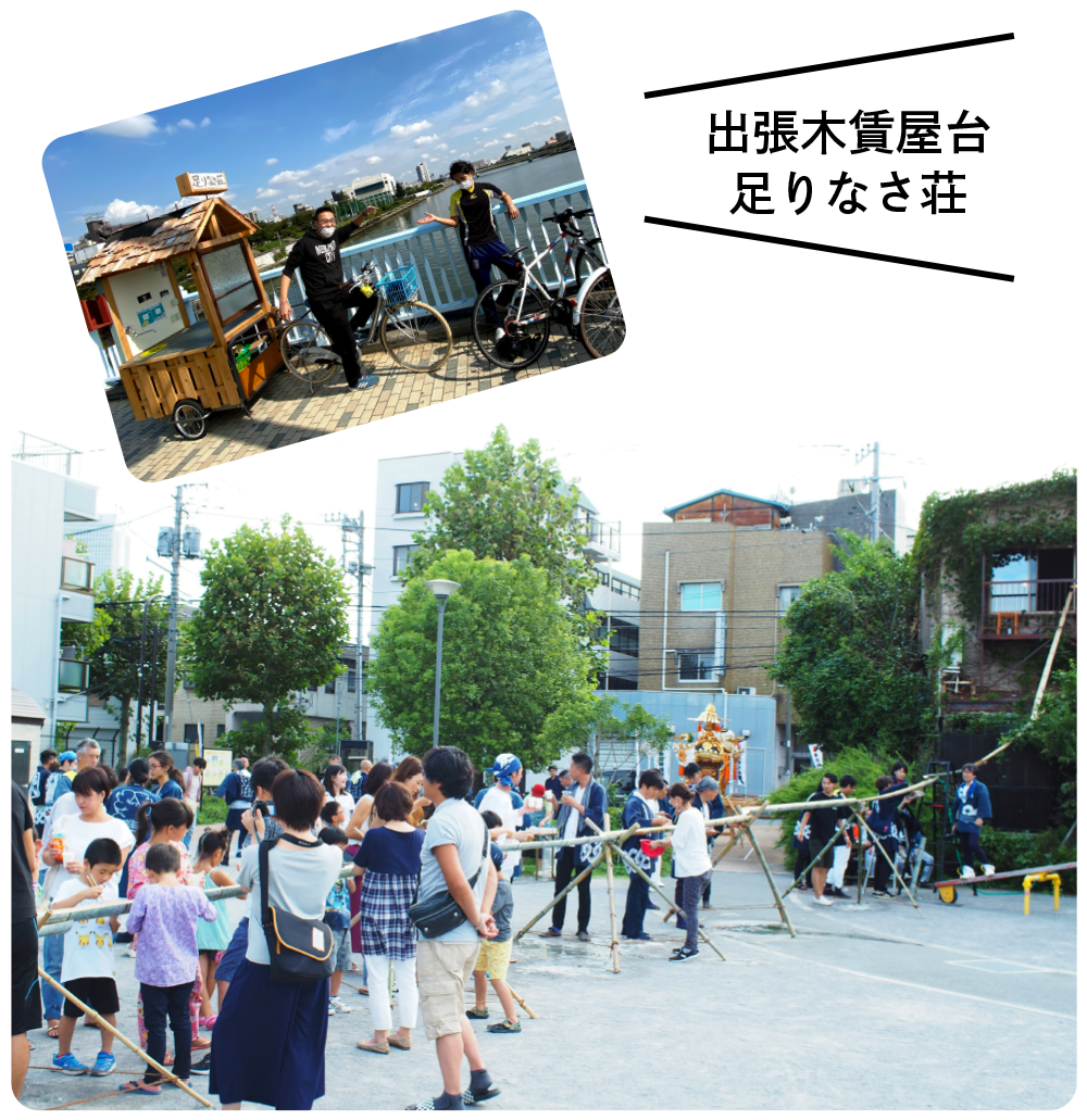 2階まちのリビングから公園に続く巨大な流しそうめんを設置したり、屋台を出したり。
