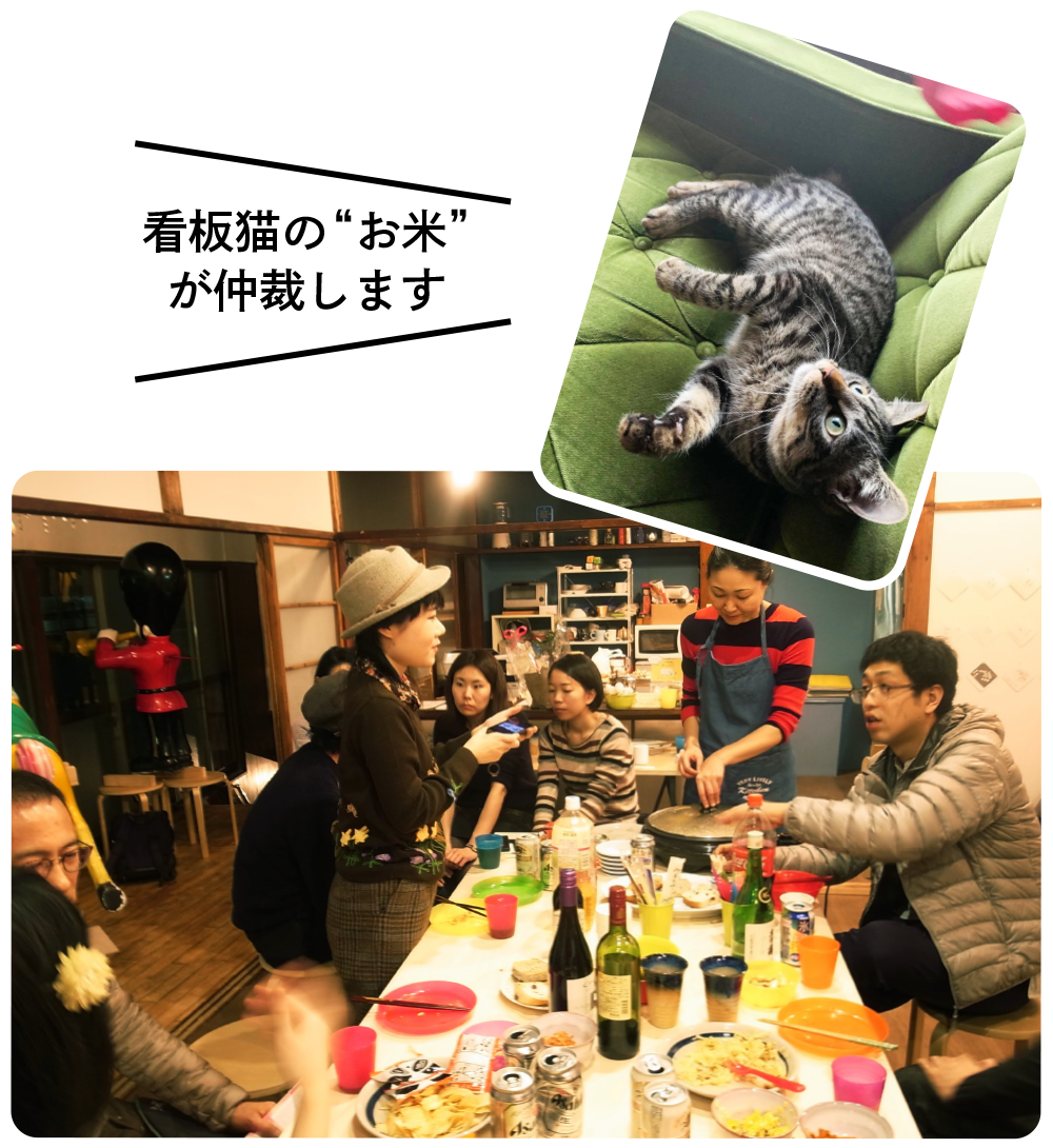 机で作業、猫とゆっくり時間を過ごす、仲間とミーティング、キッチンで料理、たまに小部屋でオンライン会議などなど。