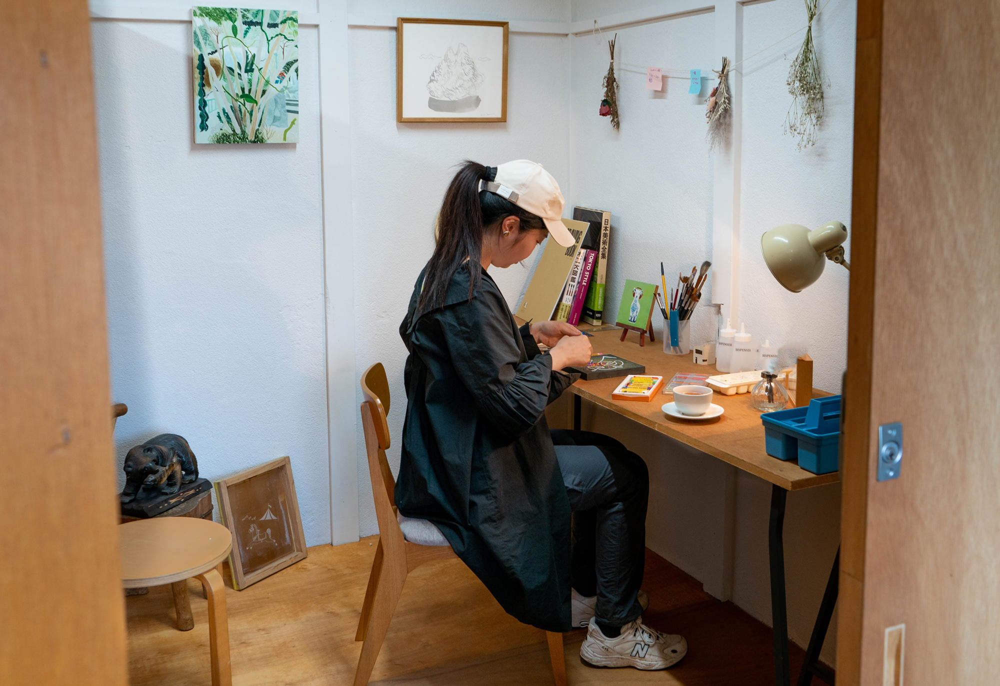 くすのき荘1階アトリエブースを借りて作品制作に打ち込む人、